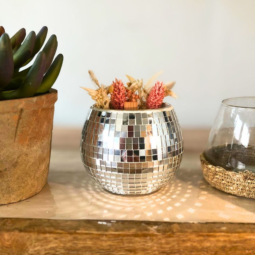Design : boule disco lumineuse, simple ou décorée de fleurs séchées stabilisées pour une version florale unique